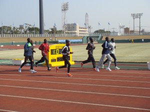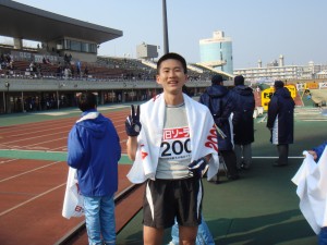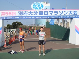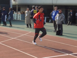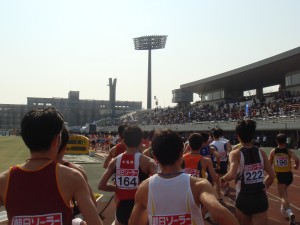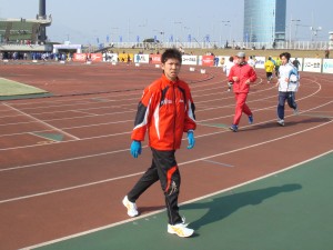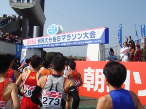 別府駅から送迎バスで大分にある競技場へ。まだスタートまで時間があるのでテンションは上がってこない。すぐそばの大分川の河川敷でのんびりしたりしてスタートを待つ。スタート1時間前くらいからトラックで体操やアップを開始。注目の有名選手も同じように普通にアップしている。特別速く走ってもいないし、歩いたりもしているから溶け込んでいる。今回注目されている2人は僕の好きな選手たちだ。それでもさすがに声はかけられなかったけど。ケニア人軍団がまとまって走っている。みんなすらっとして脚が長い。体型も走りも日本人とは違う。