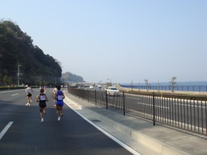 大分市街を駆け抜けていって、14km地点からはいよいよ風光明媚なシーサイドコースへ。景色は最高だけど、風よけがないので風はどうか?
