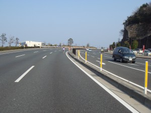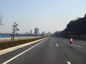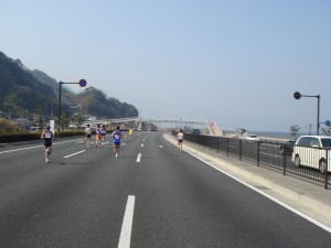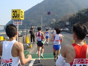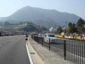 始めは5km地点まで別府とは反対方面に直線道路を走っていく。ここである程度スピードに乗っておかないと乗り遅れてしまう。ちょっと頑張りめでペースを作る。周りのペースも落ち着いてきて、誰が同じくらいで走る人か分かってきた。5km地点の手前で折り返して別府を目指す。