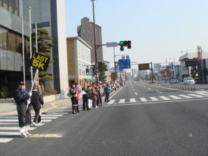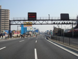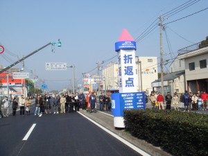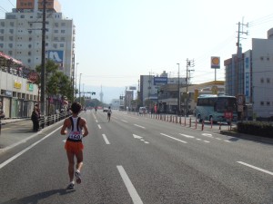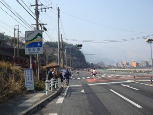 別府タワーからもうしばらく先、25.5km付近が折り返しだ。その前に先頭集団とすれ違う。細かくチェックはできなかったけど、まだ大勢いる気がした。テレビカメラ車に向かって振り返ってカメラを構えてみたけど・・・。さぁ、僕も折り返し点を目指そう。