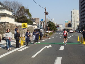 きついので頭の中は真っ白に。40km地点は府内城跡の前。この5kmは18分30秒と少しペースアップ。ラストスパートだ。41kmの舞鶴橋の上りは強い向かい風と合わせてとてもきつい。あと1kmなのにきつくて気持ちが切れそうになる。あと1km。なんて長い1kmだ。
