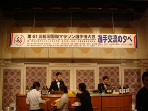 前日はホテルでの受付後、歓迎の夕べに参加。でも特に何かセレモニーがあるわけではなく、ただの立食形式の夕食会だった。料理は結構豪華で次々に運ばれてくる。久しぶりに会うランナー達と話をしながらひたすら食べまくり、結局食べ過ぎてしまった。そのままいるとキリがないので、早めに引き上げて明日に備えることにした。それでも1時間以上は食べ続けたなぁ。