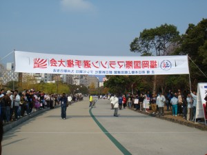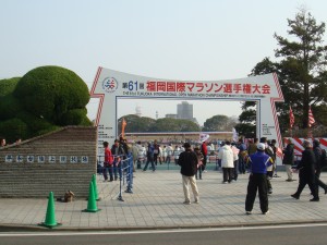 大会当日。スタートは12時10分とのことなので、ゆっくり起きてのんびり支度。9時前に中州付近のホテルを出て、歩いて平和台の陸上競技場に向かった。のんびり歩いて30分くらい。穏やかないい天気で、これは絶好のコンディションといえるだろう。一般的にはちょっと暑いくらいかもしれない。でも、これまで走ってきたウルトラマラソンに比べれば全然暑くない。当たり前か。