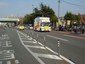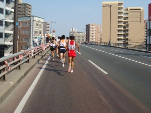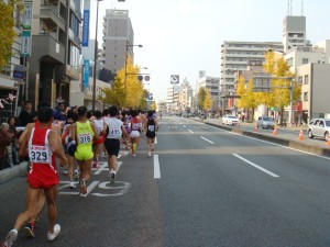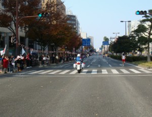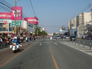 博多の中心部付近に戻ってきた。沿道の声援はますます大きくなる。知った人からの応援もあり、名簿を見て名前で呼んでくれる人もいたりしてうれしい。そのせいかは分からないけど、再び脚が動くようになってきた。集団の一番後ろに下がり、その後ろが全然いないような雰囲気を感じ取ったときは、このまま遅れて離されてはいけないと思った。
