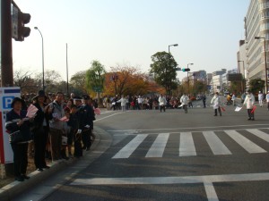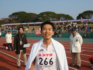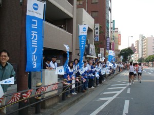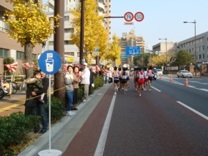 今回の福岡国際マラソンには、うちの会社の陸上部からも2人参加している。後援会が中心の応援団には、事前に僕も走ることをメールしておいた。この応援団のところを通り過ぎるときに声をかけてみたら、分かってくれたみたいだった。