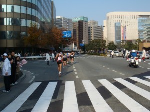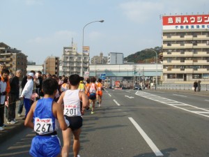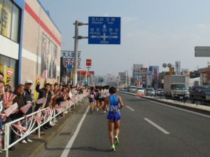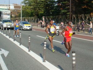 来た!さすが、初マラソンとはいってもハーフマラソン世界記録保持者のワンジル選手。そして同い年の佐藤選手も食い下がっている。うちの陸上部の選手はちょっと遅れてやってきた。「頑張れー。」
