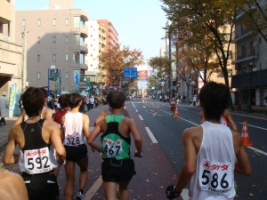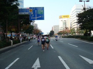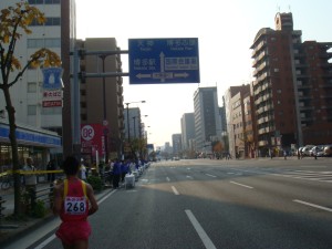 そろそろ体があったまってきたのか周りのランナーが飛ばしすぎだったのか、徐々に前へ出始めてきた。まずは西へ。5km手前にヤフードームが見えてくるはず。・・・ん?だけど建物に隠れているのか見当たらないぞ。せっかくカメラを構えて待っていたのに・・・。うーん、5km地点だ。18分をちょっと切って17分台。タイム的には狙い通り。でも感覚は思っていたより楽ではない。さてさて、どこまで持つんだろうか?