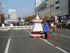 そして30km手前。いよいよトップグループが折り返してきた。今回の大会には有力選手が多数参加しているので、テレビで観戦したいくらい。さぁ、誰が先頭にいるのかな?