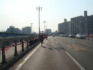 帰りは多少向かい風を感じるものの、それほどきつくはない。しばらくいくと、何だか急に脚が軽く感じられるようになって来た。まだ行くぞ。また7kmほど真っ直ぐ、博多の街に向かって帰っていく。呼吸はきついが、ここが頑張りどころだ。