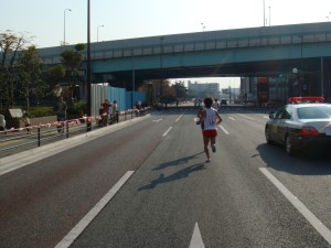 博多駅から真っ直ぐ離れていくと、前の集団に再び追いついた。このまま集団に埋まって走行かと思ったけど、すんなりと前に出てしまった。そして誰もついてくるランナーがいない。みんな結構いっぱいで走っていたんだろうか。