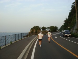 10km前。境港が見えてきたところで半島の北側へ向かう峠越えへ。先週のアップダウンに比べると大したことはないけど、いきなりですか?日本海沿いに出てしばらくいくと10km。結局あまりペースは落ち着かず、42分台で通過。ちょっと落とそう。振り返ると朝日が眩しい。