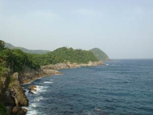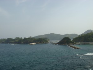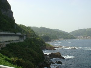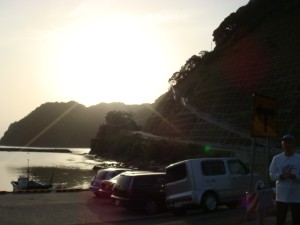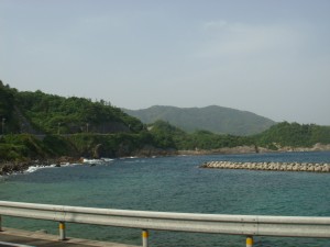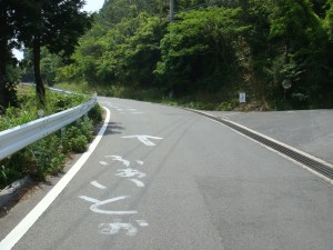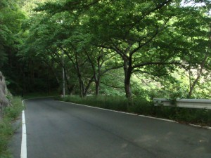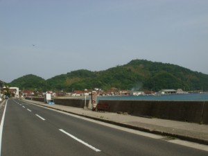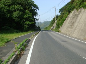 35kmくらいから、海岸線沿いの細い道「チェリーロード」を進む。なぜ「チェリーロード」?ほとんどが桜の木には見えないけど・・・。説明の立て札が立っていたけど、面倒なので読まずに素通りしてしまった。それにしても、だんだん暑くなってきたぞ。ここまで暑くなってくるとは思ってなかったから、今回は帽子もサングラスもなにも持ってきていない。ちょっと失敗だったかな?ん?まてよ。この暑さでもまだ9時だろ。これでお昼になったら大変なことになるんじゃないか?しかも今はまだ木々の中を走っているから木陰がいっぱいあるけど・・・。