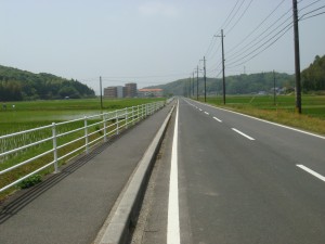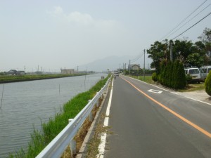 65km付近、やっと峠を上りきった様子。これを下りきったら半島の南側、宍道湖沿いを行き、あとはほとんど平坦。下りきったら辺りが開けた。そして真っ直ぐ続く道。平らになったところで思ったより脚が動かないことに気づく。いつもの苦しいパターンだ。あと30km以上もある。後ろは離れているとはいっても困ったぞ。