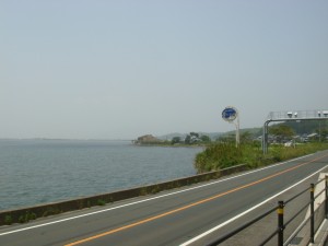 宍道湖沿いの国道に出た。昨日電車の中から見た景色よりは遠くが見渡せたが、やはり多少ガスっていて視界はいまいち。それでもやはりでかい。