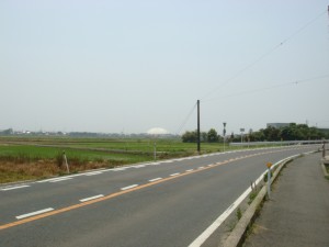 出雲ドームが見えてきた。そして、昨日見た出雲大社の裏の小高い丘が見えてきた。あのちょっと神秘的な雰囲気のある木の生え方は出雲大社の裏の山だ。もう少しだ。
