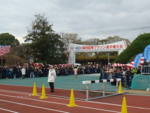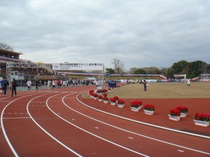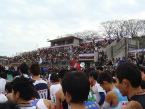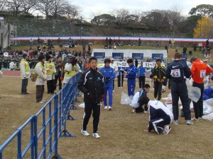 スタート1時間前くらいから、周りもアップを始めたりと慌しくなった。自分も軽くアップ。感触はまずまず。少なくとも重い感じはない。同じプレハブの大濠公園スタートの人たちは早めに移動したけど、自分達は比較的ゆったり準備できた。競技場の中は人が少なく快適。いやぁ、うれしい。ずっとこの時間を味わっていたかったけど、スタートのときは刻一刻と近づいてくる。