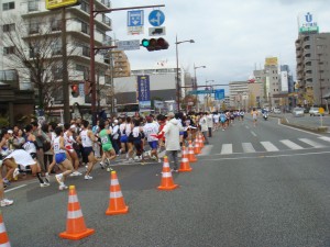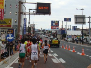 競技場から外にでても、沿道にはものすごい数の人が声援をくれていました。程なくして、大濠公園スタートの集団が合流してきました。さぁ、いよいよここからだ。大集団に吸収され、いつもの雰囲気に戻りました。それにしても、周りのランナーのゼッケン番号を見ると、自分のものとはかなり離れている。それだけゆっくり入ってしまったんだ。