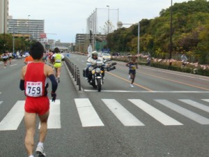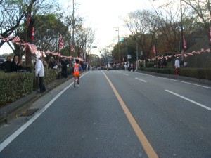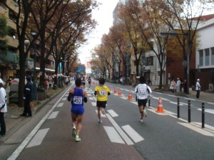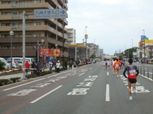 昨日地下鉄で来た箱崎宮を通過しました。九大も通過しました。その先、向こうからはトップ選手が折り返してきました。海外招待の選手が独走していました。知り合いの招待選手にも声をかけました。去年走ったので景色は覚えていますが、折り返しはまだ?といった感じです。