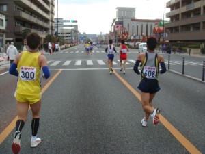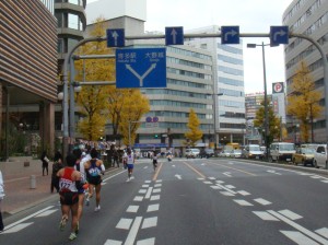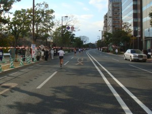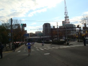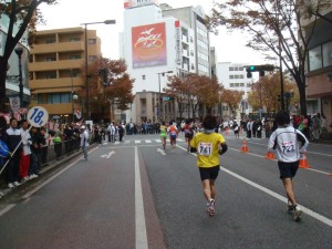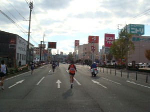 20km前に繁華街をかすめます。また声援が大きくなって気持ちいいです。知り合いからも声をかけてもらえました。でも、早くも脚に疲労を感じ始めました。まだハーフ前、まずいです。でも、このままペースをキープして、行けるところまで行くしかありません。