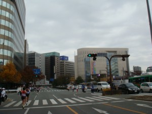 博多駅から、今度は広い通りを遠ざかっていきます。広い通りを独り占め、という感じで気分はいいです。これが都市マラソンのいいところ。でも、スピード感が変わってしまい、あまり進んでいない気がします。疲労の上に手も冷えてきたし、あまり写真を撮ることはなくなってきました。今日はもう走ることに集中したい。そうするしかない。