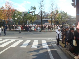 12時になって、大型スクリーンには始まったテレビ中継の模様が映し出されていました。僕も映らないかなぁ。いよいよ12時10分にスタートです。5分前になってもまだみんな上着を着たままです。いいのかなぁ。3分前になって、ようやく整列です。自分は最後列。でもスタートが遅い自分には好都合。全部で100人少々でしょうか。いい感じです。