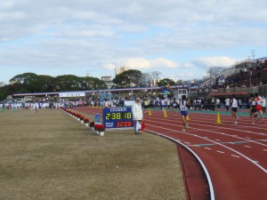 ついにスタートしてしまいました。この雰囲気、何だかうれしくて気分良くて、気持ちいいペースで入ってしまいました。しかも、何となくぼーっと感傷に浸っているようです。ふと気が付くと最後尾。しかも前との差がどんどん開いていきます。これはまずい!トラックを2周ちょっとして1kmの表示でタイムを見ると4分近く。遅すぎる!さすがにまずいと思ってペースを上げました。でも、ぶっちぎりで離されても観客から温かい声援をいただけました。この舞台でTシャツにハーフタイツでいることだけでも異様なのに、それでいて遅い。ちょっと場違いな感はありました。でもとても気持ちよかったです。3周して外に出て行くときには少し寂しさを感じました。