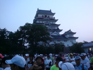 あと5kmを越え、今治の商店街に入った。もうあと少し。商店街を抜けて、いよいよ今治城が見えてきた。今年は今治城を抜けて行くらしい。前に参加したときはゴールだった今治城は一般の観光客だけで少し寂しかったけど、あと2kmだ。