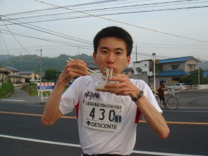 トンネルをいくつも抜け、海沿いをしばらく走り、20km過ぎに始めの島へ渡る。15kmを前にしたエイドで、早くもうどんが用意されていた。せっかくなのでいただくことにしたが、まだ走るリズムがつかみきれていない朝6時にぶっかけうどん。