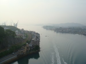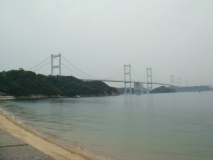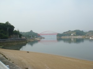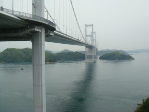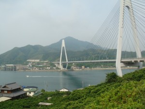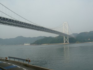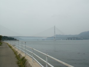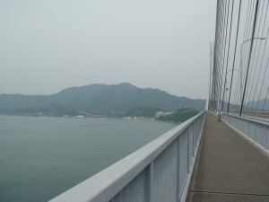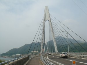早速始めの橋が見えてきた。最初の島は向島。すぐそこに島があるので、間にあるのは海とは思えず川みたい。上を見上げると、橋ははるか高いところにある。あそこまで上らないといけないのか。
