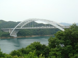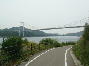 サイクリングロードの案内によると、次の大三島橋まであと2km。でも早くもくねくねと上り始めた。まだ橋は見えない。あせらずゆっくり上っていくと、ようやく橋が見えてきた。今度の橋は、ちょっと変わった形で小ぶりでかわいい。