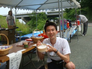 大三島でもやっぱり柑橘系。島に入ってすぐの賑やかなエイドでも勧められたので、おいしくいただきました。でもさっきから柑橘系ばっかりで口がすっぱい。あんぱんもまじえて糖分補給。水分補給はスイカとスポーツドリンク。