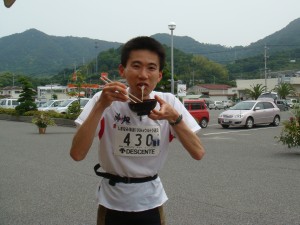 四国の最初のエイド。今治土産の鶏卵饅頭。うずら卵のようなお饅頭はかわいくて食べやすくておいしい。たくさんぱくぱくしてしまった。最後の力を振り絞るためのエネルギー補給だ。今治までのあと10kmはまだ気が抜けない。