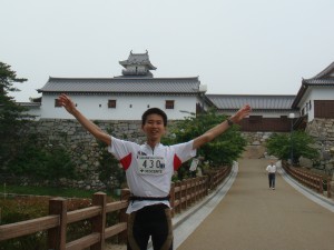 今治城の背後から、ここに来て階段を上って、もちろん歩いて、そしてお城の脇をすり抜けていく。正面からお城を後にしてあと1km。あぁ、ほっとして気が抜けてきた。でも一応最後まで何とか走ろう。あと5分ちょっとで7時間45分。