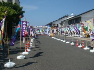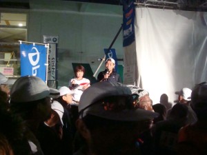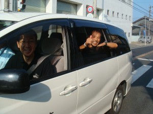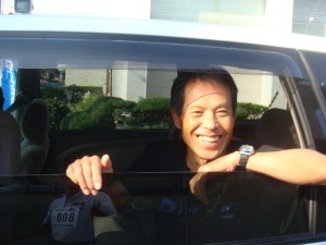 網野市街で、突然大会車両から声をかけられた。ふと見ると、丸山弁護士だ。条件反射的にお礼を言って手を降り、前へ行く車を見送る。あっ、写真を撮らせてもらえばよかった。と思ったところで、信号で車が止まった。ダッシュすれば追いつきそうだ。ところが、もう少しのところで信号が青に変わった。間に合わなかったか・・・。と思ったとき、車が減速してくれたので追いつくことができた。写真を撮らせてもらえた。「余裕だなぁ〜」。いやいや、余裕というわけではないのですが。
