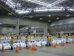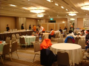 ビッグサイトのホールの中にランナー達の荷物がたくさん。そして隣のホールはがらんとしていて更衣室、休憩所にもなっていた。つい2日前の金曜日には賑やかに展示会が行われていたところに出張に来たのに、全然違う場所みたいだ。