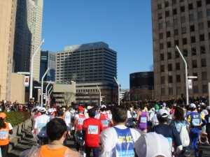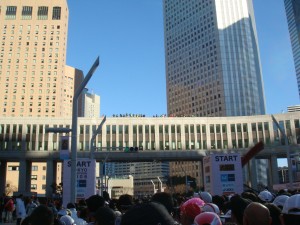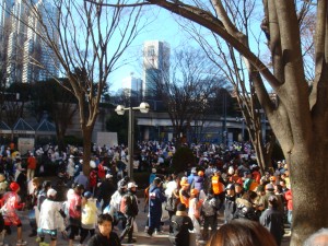スタート1時間前を過ぎたのでスタート地点に向かうが、やっぱり寒い。そしてものすごい人の数だ。荷物をトラックに預けるのも一苦労。人ごみを掻き分けて進むが、どこに行けばいいのか分からなくなりそう。そしてスタート地点へ。スタートは東京都庁。まだ40分前なのに前には行けず、身動きも取れない。体操もできないので、脚が固まってしまいそうだ。