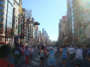 まずは新宿歌舞伎町の街中を走っていくが、普段見ている景色とは全く違う。予想していたよりも、とっても気持ちがいい。こんな街の真ん中を走れるなんて。一気にわくわくしてきた。だんだんペースが上がってきた気がするぞ。知り合いランナーにもどんどん会い、一言ずつ交わしながら進む。