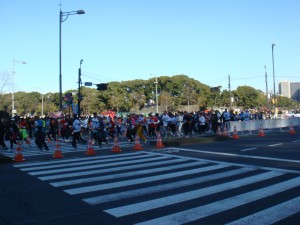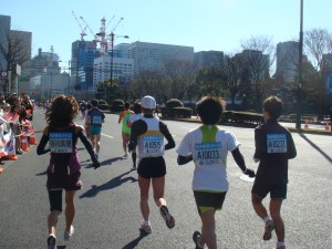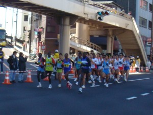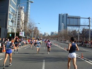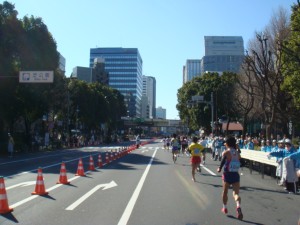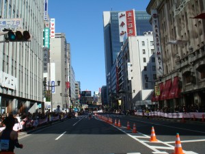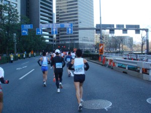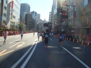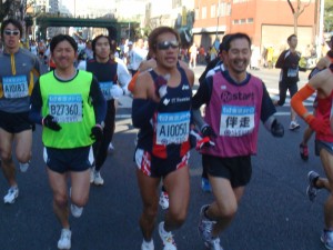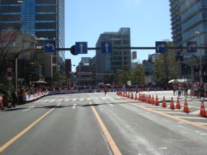セレモニーが終わり、石原都知事の号砲でいよいよスタート。陸連登録者のゾーンからのスタートではあるけど、いろんなペースの人たちがごちゃ混ぜなので、全然スムーズに進めない。全くリズムがつかめない。まぁ、今回はゆっくり楽しんで走る予定なので、始めはのんびり行ってちょうどいいかもしれない。