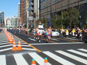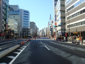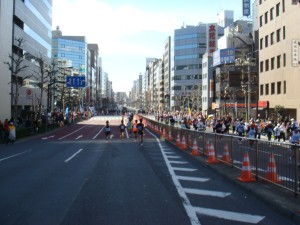 銀座から日本橋への賑やかな通り。でも今日は普段とはちょっと違う。沿道にはたくさんの人たちがいるけど、いつも歩行者天国になる道はランナーの貸切。ランナー天国。いやぁ、高級なお店の中を抜けていくのは気分いいぞ。でもずっと日陰になっているので、特に手がだんだん冷えてきた。手がかじかんで動かなくなると写真が撮れない。カイロを手袋の中に入れてはいるものの、これだけでは不十分なくらいかもしれない。