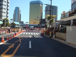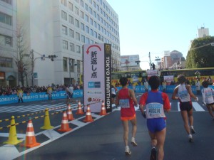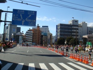 写真を撮るために立ち止まろうかとも思ったけど、一度立ち止まってしまうと再び走りだすのがきついと思ったので、カーブを切りながら走りながら写真を撮った。沿道からは大きな笑い声。元気をもらって、また日本橋へ折り返していく。