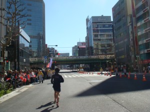 品川へは国道15号線、第一京浜を真っ直ぐ進む。沿道からの応援は途切れないが、真っ直ぐ単調な道だ。ビルが立ち並ぶため、日陰ばかりで少し冷えてきた。所々でビル風のような風が吹いてくる。ちょっと気持ちが落ち着いてきたか。