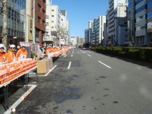 大会当日。去年は雨の中の大会だったようだが、今年はとってもいい天気だ。ただ、寒い。新宿駅で降りると、今日走るらしい人がたくさんいる。その流れからは少し外れて、集合場所のホテルへ。VIPルームが用意されていて、軽食とアミノバリュー、SOYJOYなどがたくさん用意されていた。SOYJOYなどはたくさんかばんの中へ。お持ち帰り。これなら朝ご飯を食べてこなければよかった。しかも寒くないし、トイレもきれいで並ばない。落ち着いて準備ができた。