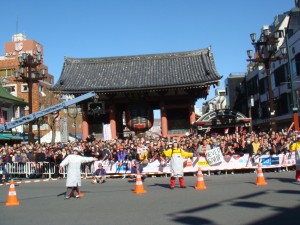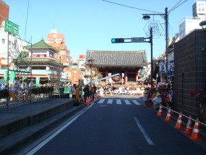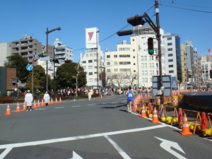 日なたはまだいいけど、日陰は寒い。いよいよ手がかじかんできた。片手ではシャッターが切れなくなってきた。仕方がないので両手で写真を撮る。これがまた沿道の受けがいい。笑いが漏れる沿道に向けてまた手を振る。楽しいことは楽しいけど、だんだん疲れてもきたぞ。それでも、今回はタイムは狙ってないから沿道に手を振るほうに力を入れる。さぁ、いよいよ目の前に見えてきたのは浅草の雷門だ。沿道の人も増えてきた気がする。