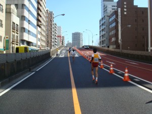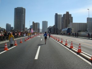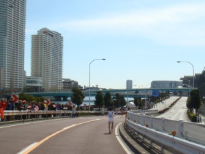 さぁ、この先はいよいよちょっとアップダウンが現れてくると聞いている。あぁ、あの陸橋を登るのか。でも思ったほど大したことはないみたいだ。追いついたランナー達は苦しそうに登っているけど、僕にはそんなにきつくない。陸橋の上は部分的にしか歩道がないので、沿道からの応援が途切れるところがぽつぽつとある。手を振らなくていいので、少し落ち着いて走れていいか。