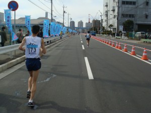 折り返したら、ちょっと向かい風を感じる。でも大したことはないけど、ずっと日陰でだんだん体が冷えてきた。真っ直ぐな道を進むにつれ、徐々に向かい側を走るランナーの数が増えてきた。ずっとそっちを見ながら知り合いを探す。これだけの人数の中から探すのは結構大変だけど、何人か発見して声を交わす。このすれ違いもこのマラソンの売りなのだそうだ。