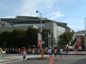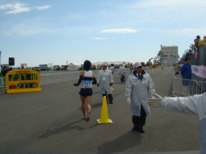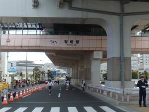 有明をかすめ、ゆりかもめの有明駅を抜けて、いよいよビッグサイトに到着した。最後にちょこっとあったアップダウンが終盤のランナー達を苦しめている。あとちょっとだ。