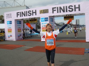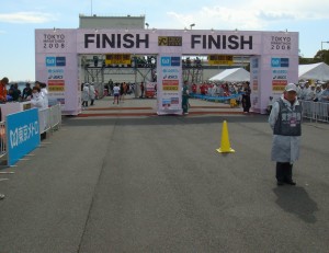 ビッグサイトをぐるっと回って、そろそろフィニッシュ地点のはずだ。あと1kmを過ぎてから結構走っているけど、どこがゴールなんだ?あぁ、あの直線の先のあれか。最近は競技場のトラックを回ってゴールということが多かったので、ちょっと戸惑ってしまった。これまでのものすごい沿道の人並みを考えると、ゴール地点は少しさびしい気もした。でもデジカメを構え、手を振りながらゴール地点を目指すと声援が沸き上がる。場内の放送でもデジカメについてコメントしてくれた。