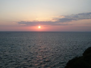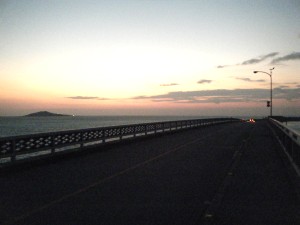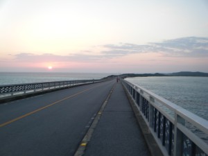 コースは島を一周するようなコースです。始めは南から北に向かいます。一番北で橋を渡って小島に渡る頃に、ようやく明るくなってきました。もうすぐ30kmです。海や朝焼けがとってもきれいです。
