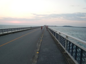 最後の小島に向けての長い橋。ここの海は、ついにエメラルドブルーというか、これまでとは違った色みの海が広がっていました。天気も素晴らしいし、最高!感激しながら橋を渡って行きます。端の途中にアップダウンがあり、島に渡ってからも厳しい上り坂があって歩きそうになってしまいましたが、何とか走り通しました。あとはゴールに戻るだけです。残り5km。