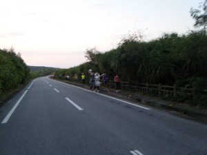 スタートしてしばらくは真っ暗です。外灯もまばら。ほとんどの人たちはライトを持っていましたが、自分はここまで真っ暗だとは思わなかったのでライトなしです。しかも車道を走れるわけではないので、用心しながら走らなくてはいけません。しばらく進むと、今回のチャレンジャーを含む2人の後ろに付く位置取りになりました。本当はもう少しゆっくり行こうと思っていたのですが、出来る範囲でフォローはしていようという気にはなりました。